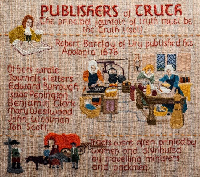The Quaker Tapestry reproduced here consists of more than 40 embroidered panels illustrating the history of Quakerism from the 17th century to the present day. Made by over 4,000 men, women and children from 15 countries over 15 years, the tapestry has a permanent home at the Friends Meeting House at Kendal, Cumbria. For more information and to book a viewing, please browse their website here.